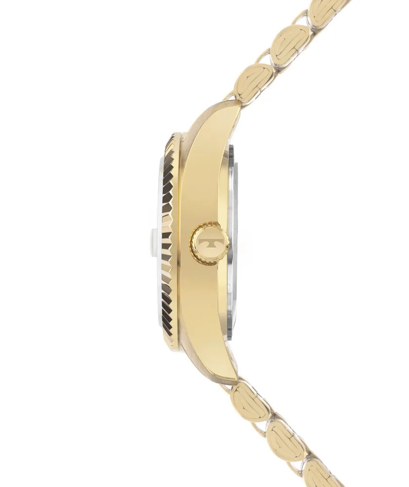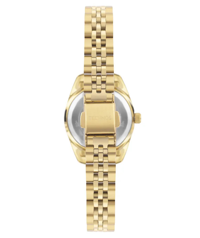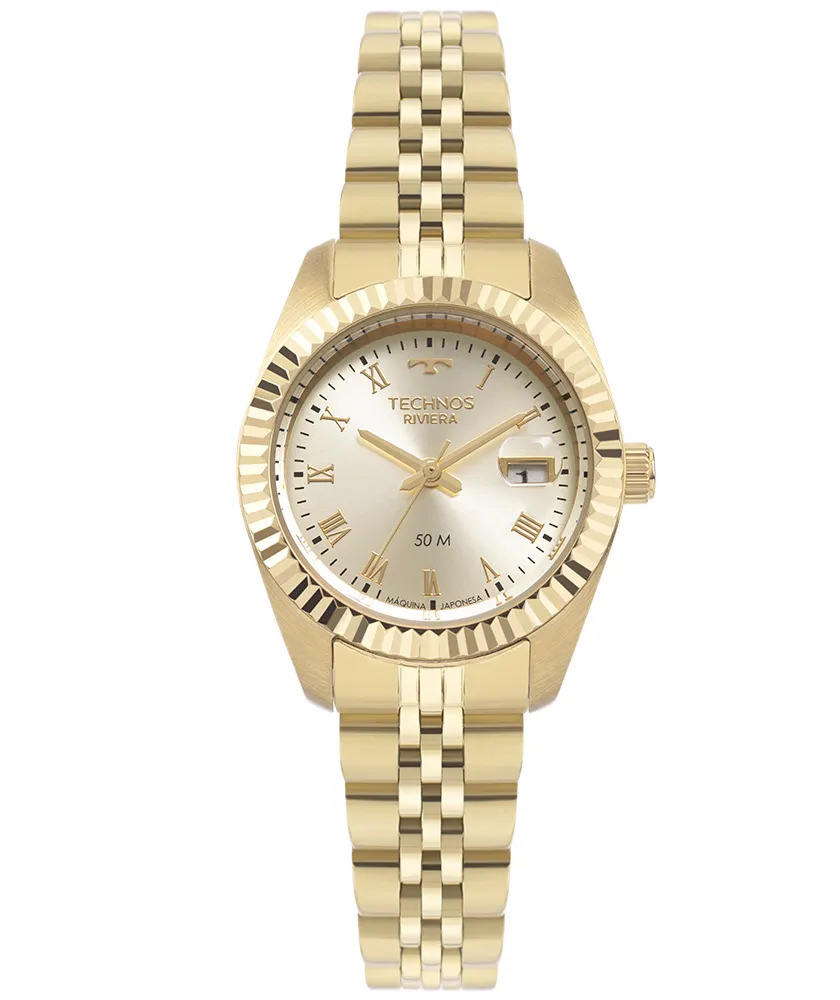 Relógio Technos Riviera feminino com elementos tradicionais do universo relojoeiro, como o aro externo corrugado e pulseira de aço 5 links. Sua caixa pequena é complementada pelo mostrador com elegante numeração romana e vidro com lupa de calendário. Produto 100% em aço inoxidável em banho dourado, com máquina quartz Japonesa Miyota, calendário e resistência à água de 50m. Tamanho de caixa 28,5mm.