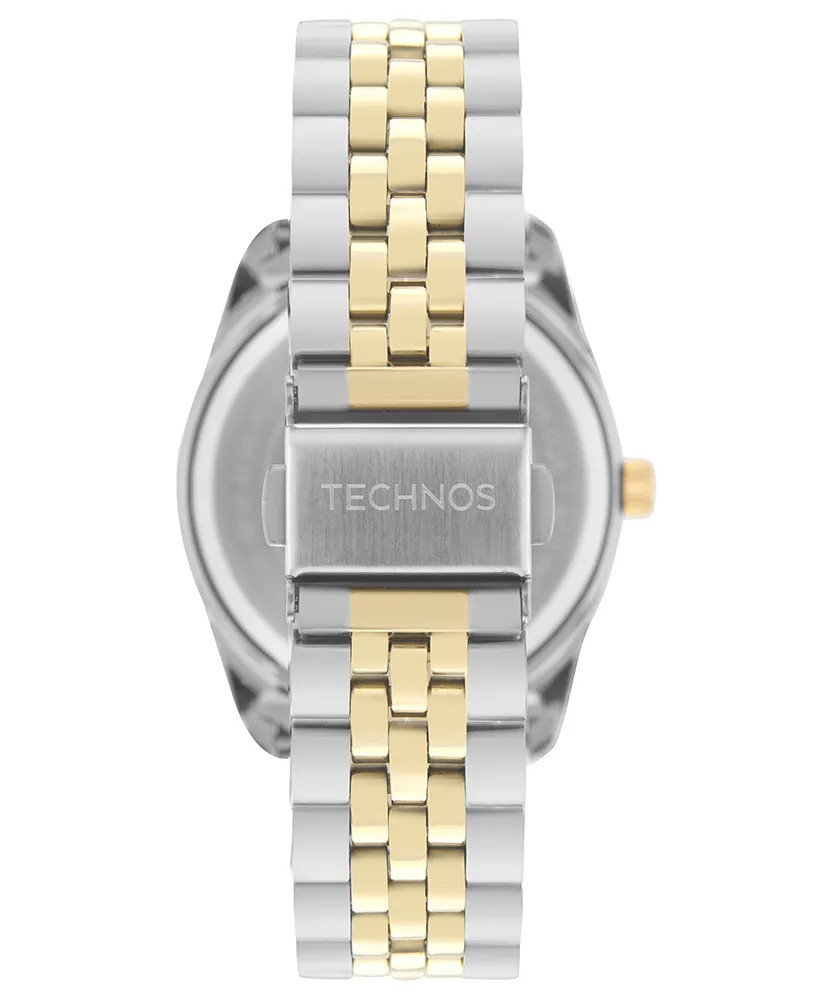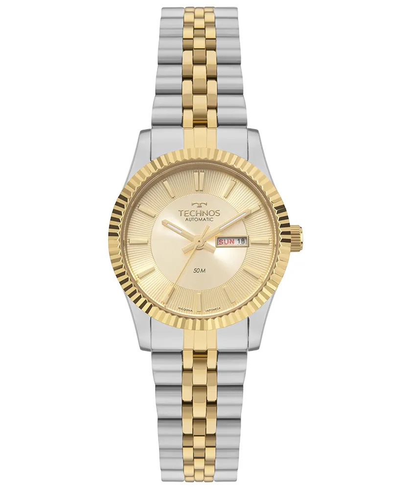 A linha Technos Automático Day-Date apresenta novos modelos femininos que unem tradição e sofisticação em um design clássico. Com maquinismo automático japonês, calibre 6T51, corda manual e por movimentação, reserva de marcha de 40 horas e 21 jewels, é uma coleção que traduz a precisão relojoeira com elegância. O fundo rosqueado de vidro revela o movimento interno, enquanto o aro externo com acabamento corrugado e o mostrador texturizado reforçam o acabamento refinado. Com o toque do calendário day-date e pulseira em aço inoxidável 5 links, a coleção apresenta resistência à água de 50 metros. Além disso, possui caixa de 30mm, mostrador dourado e banho bicolor dourado/prata.